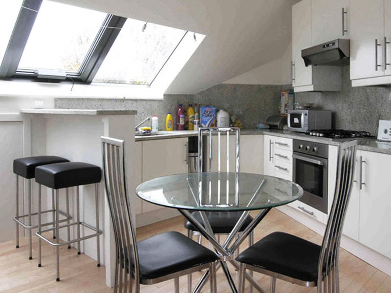 Stealing some hallway, and fitting of Velux windows, allowed the creation of a bright kitchen in its own space, and the creation of a regular shaped bathroom.