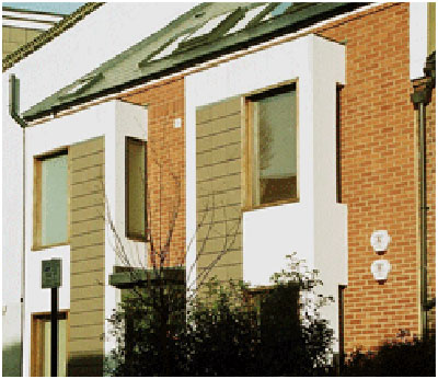 A contemporary terraced building juxtaposed with Victorian 2 up 2 down houses in West Hampstead.