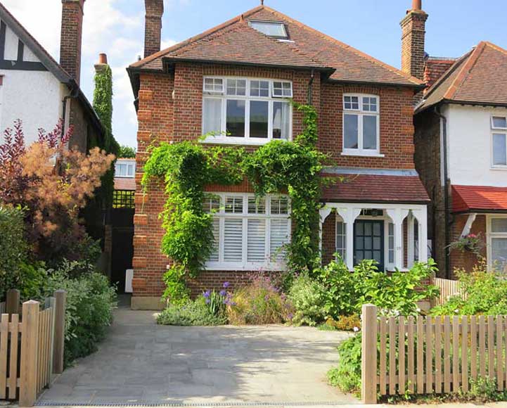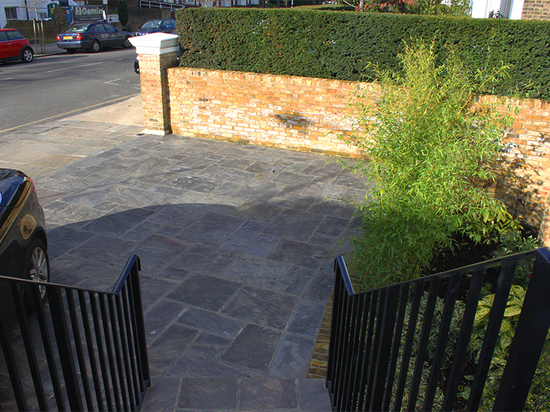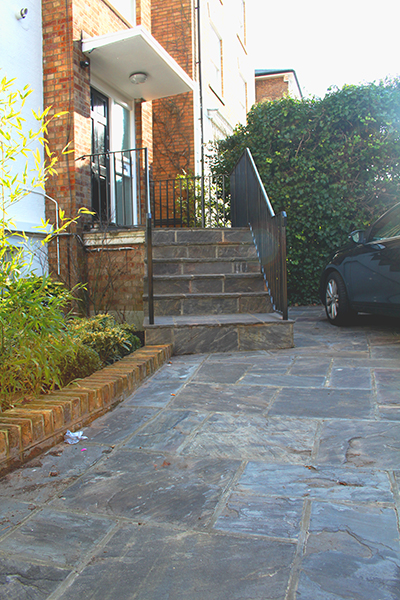 Grey Indian sandstone compliments the red brick house on this drive in Dartmouth Park.